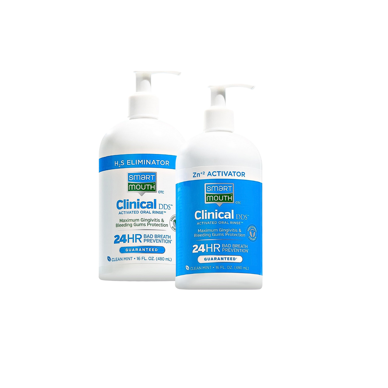 SmartMouth™ Clinical DDS 2-Bottle Activated Mouthwash System delivers a full month of clinical-strength fresh breath protection in convenient pump bottles. Each 32oz bottle set keeps the Sulfur Eliminator and Zinc Ion Activator separate until it’s time to mix and rinse, ensuring maximum effectiveness every time. SmartMouth™ Clinical DDS Activated Oral Rinse combines zinc ion technology with maximum anti-plaque and anti-gingivitis benefits to help prevent bleeding gums. This patented solution eliminates bad breath and prevents it from returning for 24 hours with twice daily use. SmartMouth™ Clinical DDS is an OTC substitute for prescription chlorhexidine rinse. Unlike prescription chlorhexidine, SmartMouth™ does not cause chlorhexidine staining, has zero alcohol, and is always paraben free.