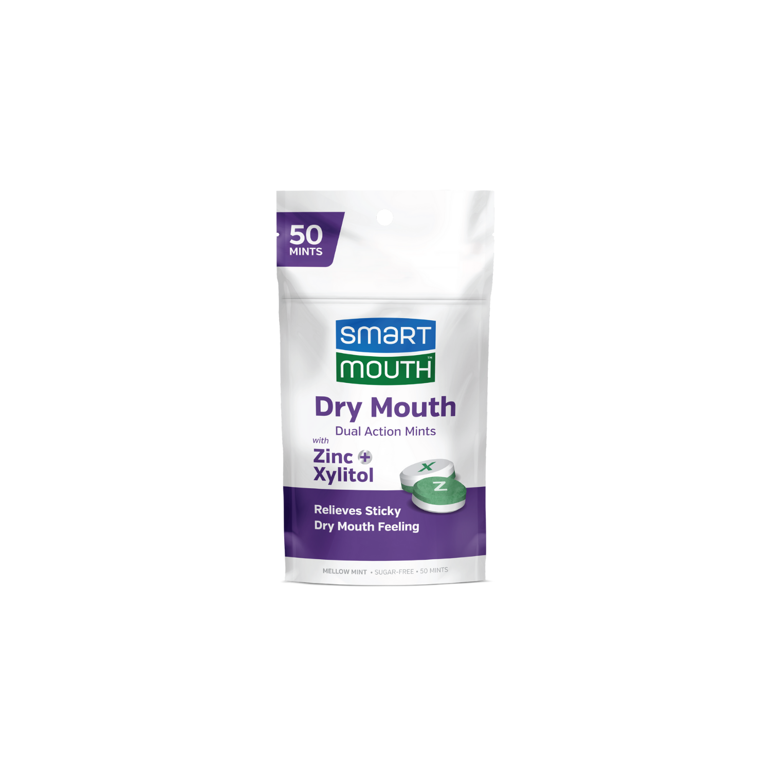 SmartMouth Dry Mouth Dual-Action Mints contain zinc to promote a healthier mouth and xylitol, a saliva stimulant. These mild mints can be used any time of day for temporary relief of minor dry mouth.