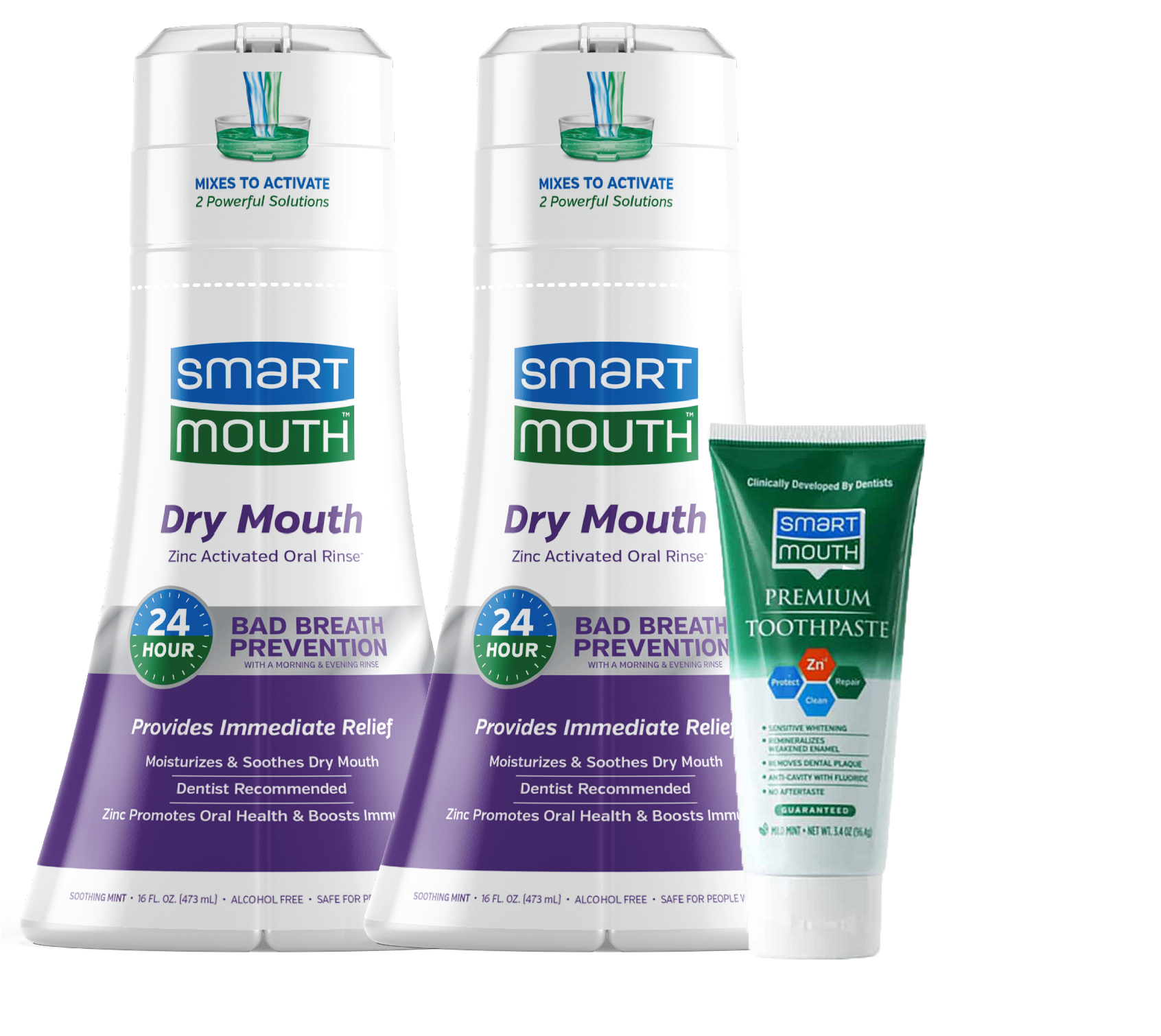 Our Dry Mouth SmartBox contains 2 bottles of our Dry Mouth Rinse formulation that can help you get relief quickly. SmartMouth™ Dry Mouth Activated Oral Rinse provides relief from the symptoms and discomfort of dry mouth. SmartMouth™ Dry Mouth refreshes, moisturizes, rehydrates, cleans, and soothes oral irritation while lubricating oral dryness. SmartMouth™ also utilizes patented zinc ion technology to eliminate bad breath while preventing it from returning for 12 hours per rinse.