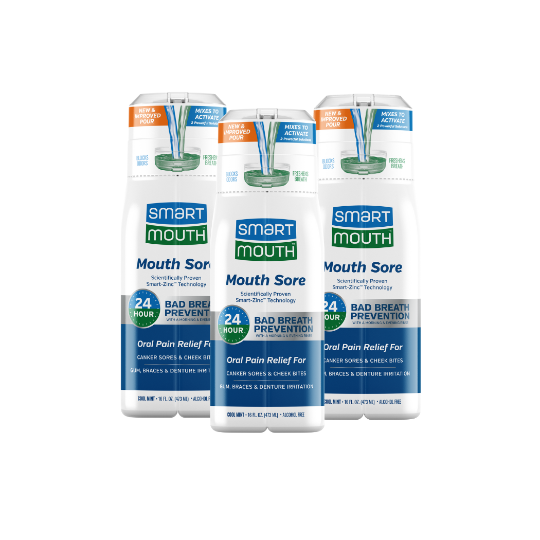 SmartMouth™ Mouth Sore Activated Oral Rinse helps alleviate minor irritation, pain, sore mouth, sore throat, and canker sores. All while delivering the same patented zinc ion formula to eliminate bad breath and prevent it from returning for 24 hours with twice daily use.